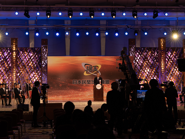 民間放送全国大会(民放大会)は、その年の優秀な番組を日本民間放送連盟賞として表彰する式典だ。併せて民放連の会長あいさつも行われる。全国の民放関係者が集まるテレビやラジオ業界にとって年に一度の大きな行事である。ステージの美術や演出は一般の祭典と異なり凝った作りで、テレビ番組の特番のセットデザインそのものだった。