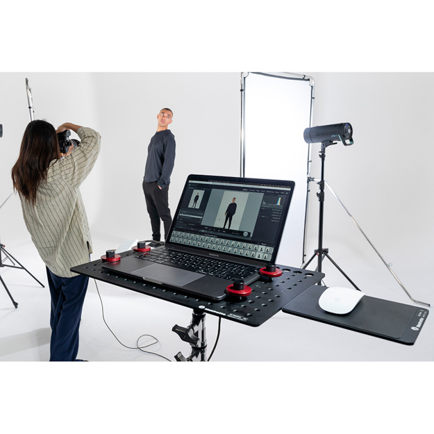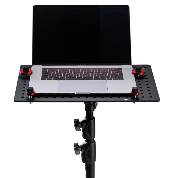 三脚やライトスタンドに取り付けてノートPCで作業を行うときに便利なラップトップデッキ。厚さ4.8mmの軽量アルミ製で、46cmx31cmまでのノートPCを取り付けることができるという。取り付けは、16mmメス(5/8)、3/8インチネジ、1/4インチネジ、アルカスイス互換プレート使用可能雲台に対応。主要な場所にある3/8ネジを使用した滑り止め金具で、より安全に取り付けることができる。