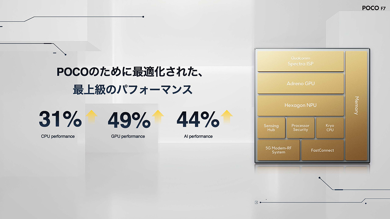 今回のPOCO F7には、「Snapdragon 8s Gen 4」が搭載された。これは現時点では日本市場初登場となるため、発売後には日本の消費者が国内で販売されているスマートフォンとしては、このチップセットを最も早く手に取ることができる。