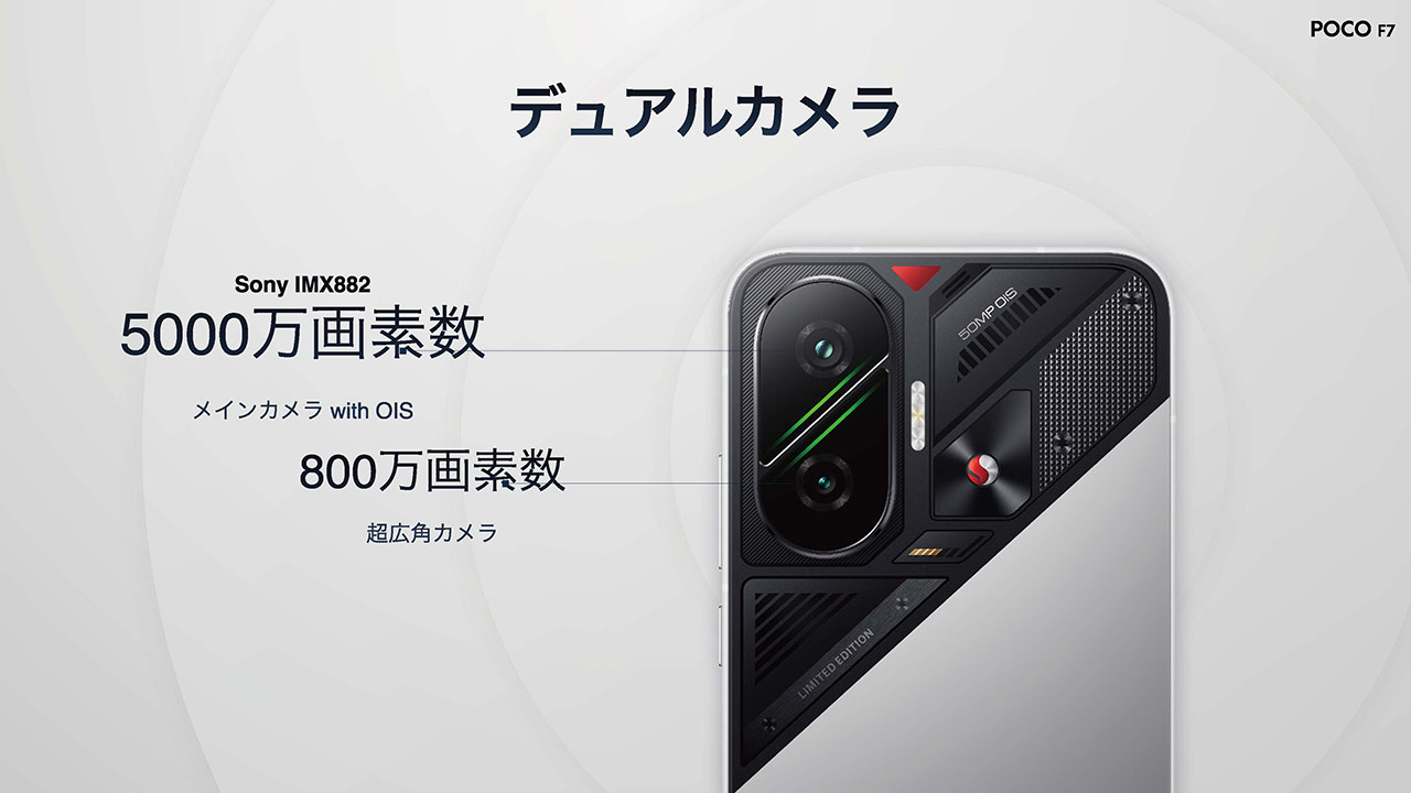 フラッグシップカラーは「サイバーシルバーエディション」である。これまでのフラッグシップカラーと同様、今回も非常にエッジの効いたデザインが採用された。例えば、2025年2月に発表されたPOCO X7 Proは、イエローとブラックのツートンカラーでその個性を際立たせていた。今回のPOCO F7も同様にデザイン性が高く、万人受けするとは限らないものの、特定の層には非常に魅力的に映る、個性的なデザインに仕上がっている。