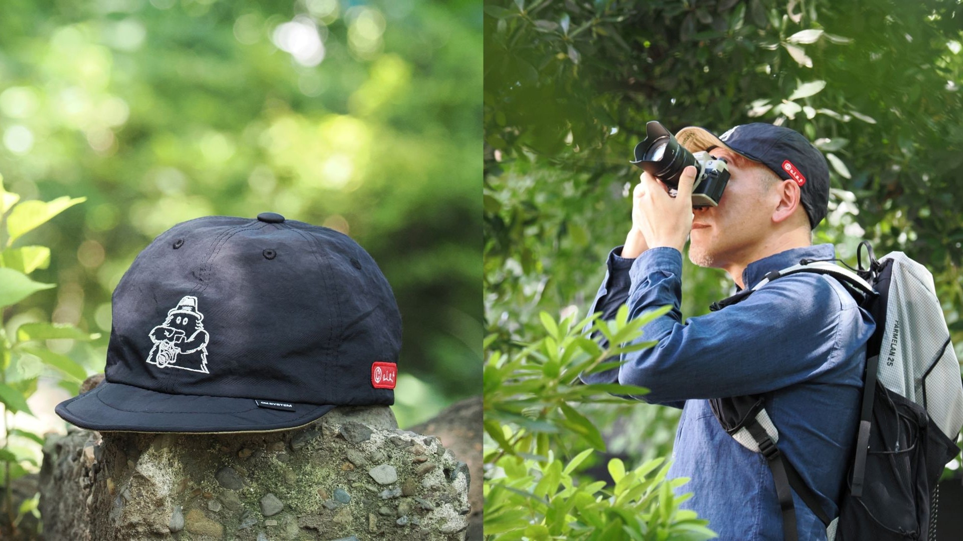 OM SYSTEM × OUTDOOR MONSTER × Clef オリジナルキャップ(左)、装着イメージ(右)