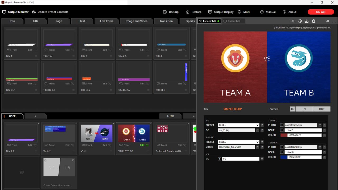 Graphics Presenterは、Windows PCとローランド製機器をHDMIケーブル1本で接続するだけで、Fill/Key合成によるグラフィック/テロップの送出を実現。テンプレートも豊富で、イベントやライブ配信、スポーツ中継などの演出を強化できる。