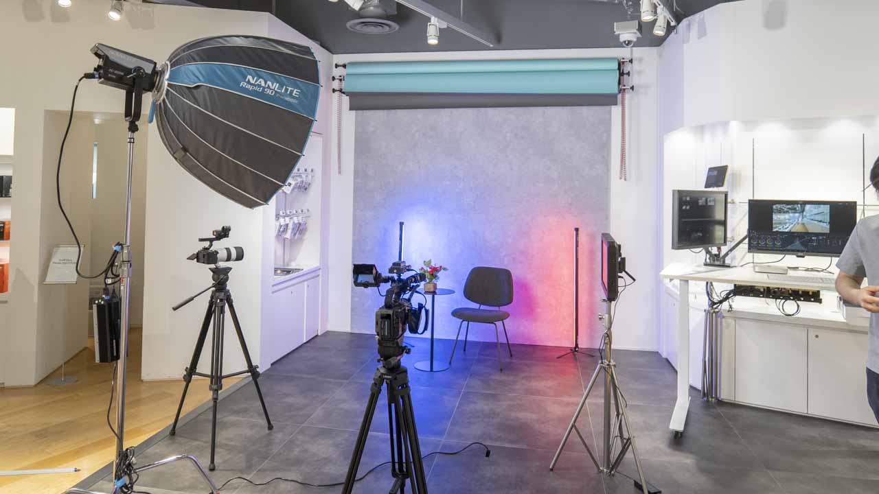リニューアルの大きな目玉の一つが、4階に新設された動画コーナー「シューティングスタジオ」だ。ここは単に機材を展示するのではなく、プロの制作環境を再現し、そのソリューションを丸ごと体験できる画期的な空間となっている。