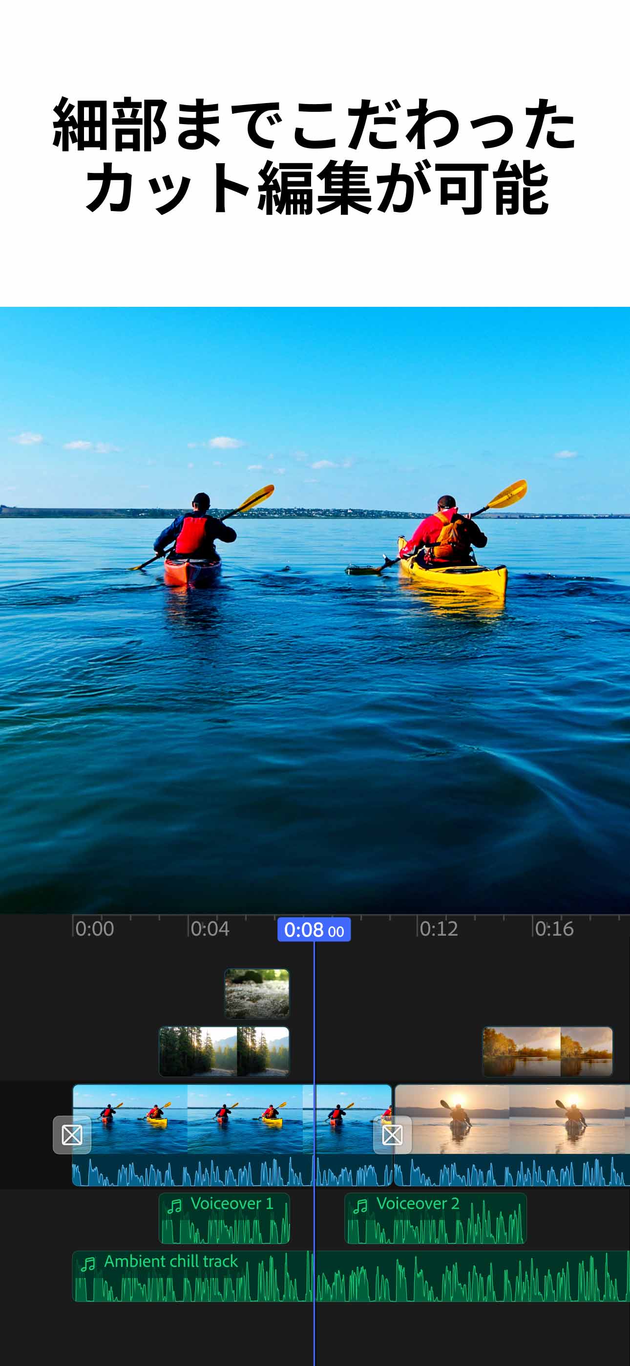 デスクトップ版でおなじみのマルチトラックタイムラインを搭載し、モバイルの画面でありながらフレーム単位での精密な編集を実現した。動画、オーディオ、テキストのレイヤーを無制限に追加できるほか、AIによる「字幕を自動生成」機能や4K HDR出力にも対応するなど、プロの現場で求められる多彩な機能を網羅している。
