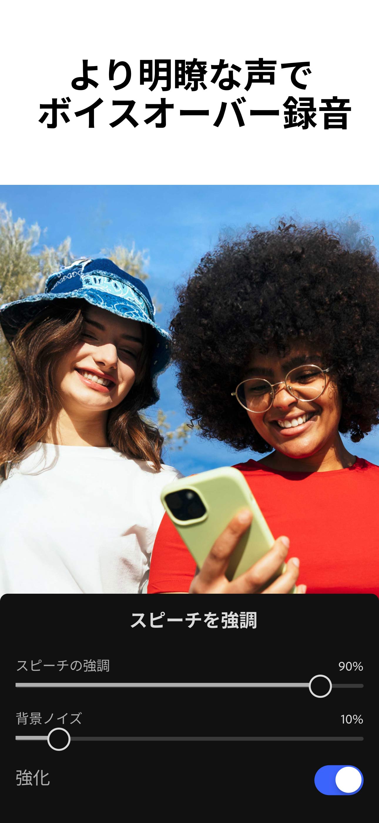 オーディオ機能も飛躍的な進化を遂げた。テキスト入力や自身の声から効果音を生成する「効果音生成」機能や、AIが周囲のノイズを劇的に低減して音声をクリアにする「スピーチを強調」機能により、スタジオ品質のサウンド編集が指先一つで可能である。
