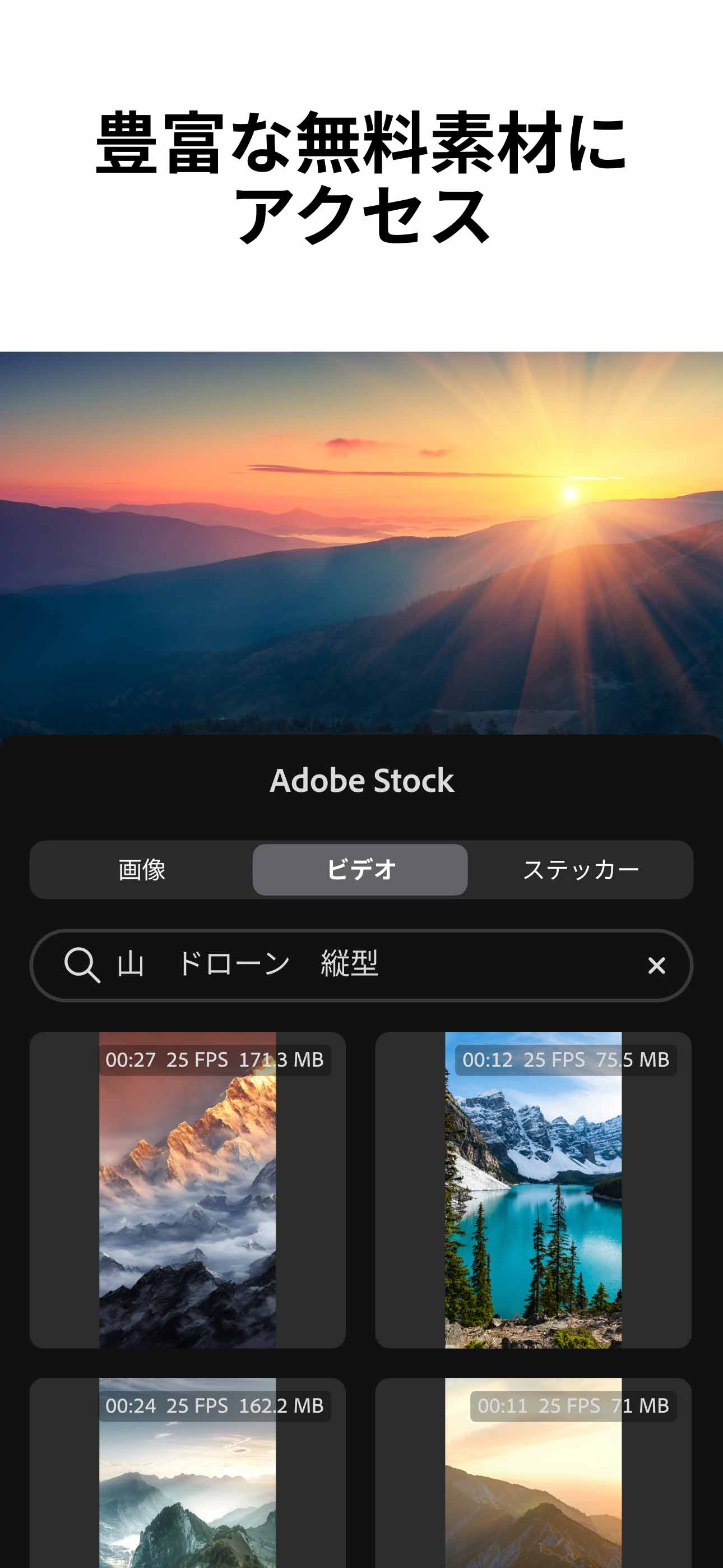 さらに、革新的な生成AI「Adobe Firefly」を搭載し、テキストから動画、画像、音声といった素材をアプリ内で直接生成できる。これに加え、数百万点に及ぶAdobe Stockの音楽、写真、動画などのアセットも無料で利用でき、クリエイターの尽きることのない創造性を強力に支援する。