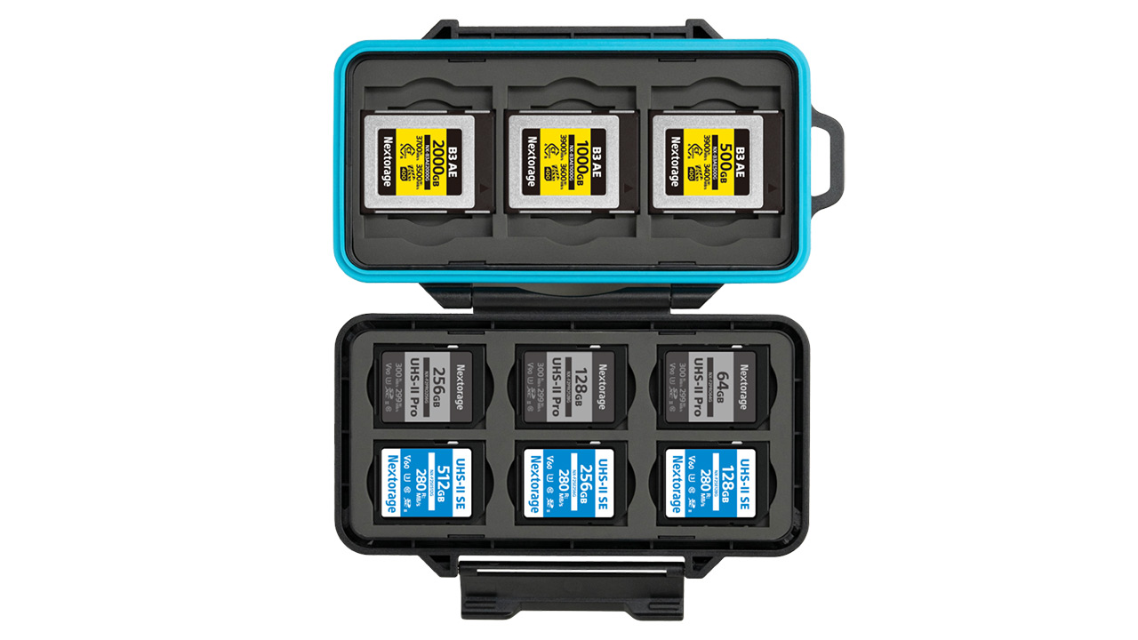 同製品は、複数の規格のメモリーカードをまとめて収納できるケースである。内部にはカードスロットが設けられており、SDカードを最大9枚、CFexpress Type Aメモリーカードを最大6枚、そしてCFexpress Type Bメモリーカードを最大3枚、合計で最大18枚のカードを収納することが可能である。また、CFexpress Type B用のスロットには、CFastメモリーカードを3枚収納することもできる。