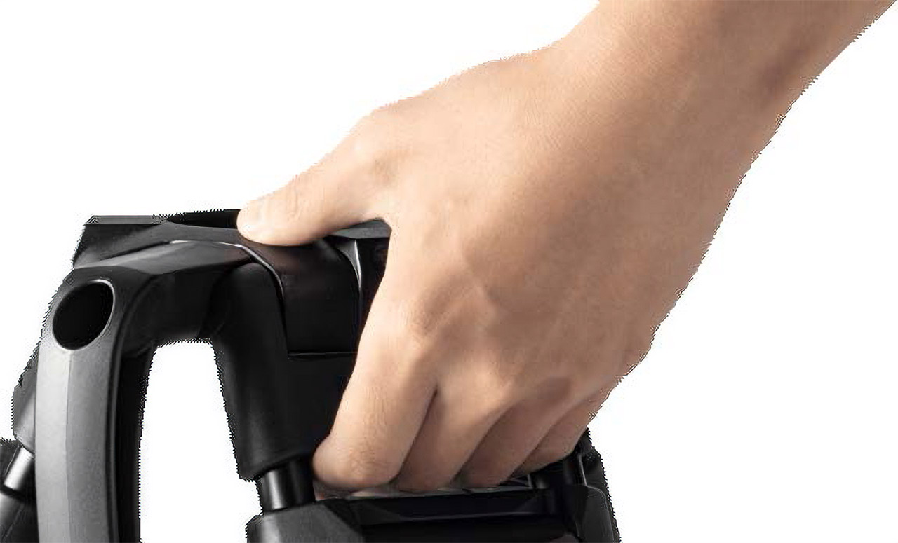 上段の脚ロック部にはアルミダイカスト部品を使用し、高い固定力を発揮する。運搬性能が飛躍的に向上するキャリングハンドルは、オプションではなく、標準装備されている。不要な場合は簡単に取りはずすこともできる。