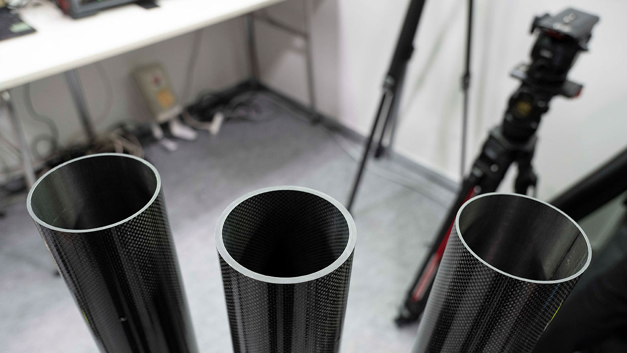 JIROJIBの新製品「JIROJIB 10」は、直径10センチのカーボンアームを採用したモデルで、従来の7センチモデル「JIROJIB 7」よりも太径化されている。本製品の特徴は、着脱可能なインロー(継ぎ手)式の組み立て構造を採用した点にある。パーツを短く分解してケースに収納できるため運搬性に優れ、現場で必要な長さに応じて組み立てが可能だ。