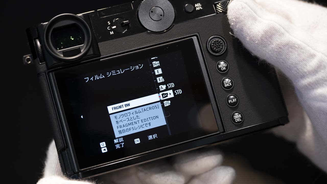 通常モデルと比較すると、天板の研磨加工や外装素材、ロゴ処理に至るまで徹底した作り込みが施されており、電源投入時の演出や本機専用のフィルムシミュレーションレシピ(FSレシピ)「FRGMT BW」など、ソフトウェア面にも思想が及んでいる点が印象的だ。ETERNAが“使うためのGFX”を提示しているとすれば、本機は“所有し、味わうGFX”を体現するモデルであり、Hello GFXというイベントが持つ多層的なメッセージを補完する存在として静かな存在感を放っていた。