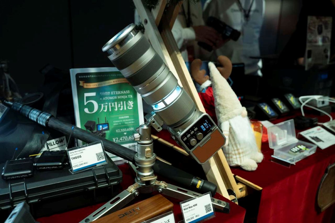 しかし今回の展示では、IDXの小型VマウントバッテリーとGF55mm F1.7を組み合わせ、RS 4による運用が成立していた。重要なのは、この構成が「特別なデモ」ではなく、ETERNAを日常的な制作現場に持ち出すための現実解として提示されていた点である。これは「中判シネマ全体が変わった」という話ではなく、GFX ETERNAというカメラを軸に組み立てた場合、ここまで運用の自由度が下げられるという、極めて具体的な展示メッセージだった。