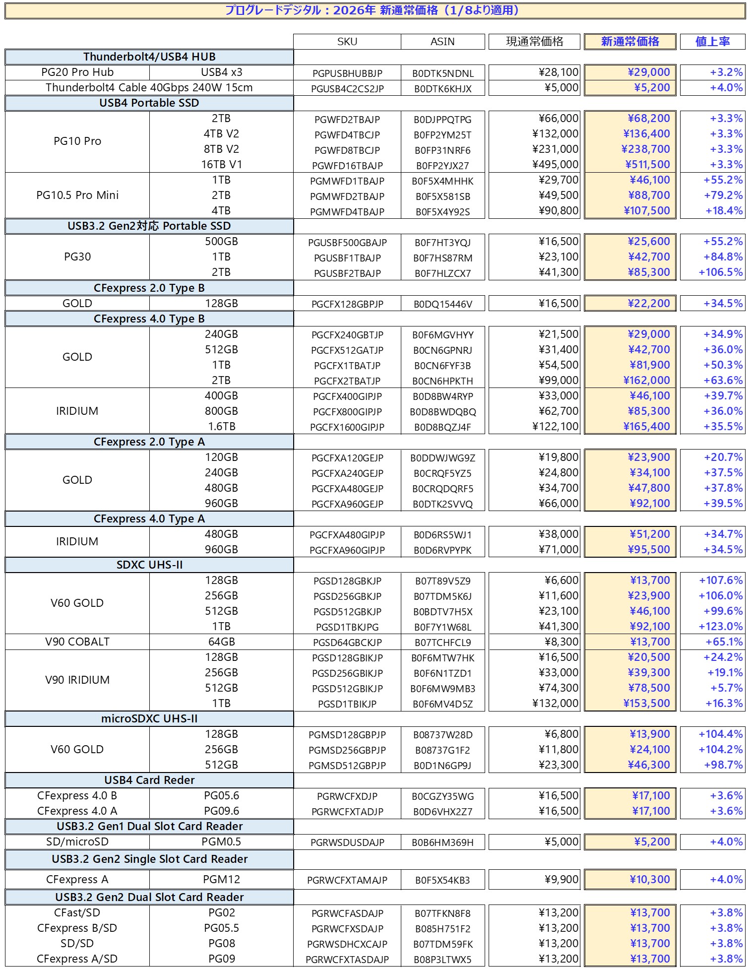 プログレードデジタル(ProGrade Digital)は2025年12月29日、同社公式ストアにおける通常価格を、2026年1月8日付で改定すると発表した。改定後の主な製品価格は以下の通りとなっている。