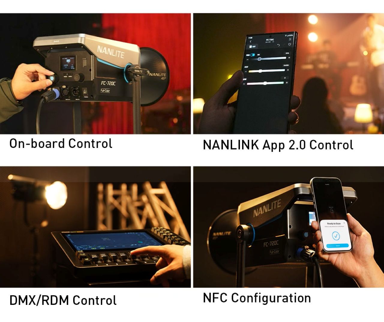 FC-720BおよびFC-720Cは有線・無線制御オプションを提供する。2インチディスプレイに2つのノブとボタンを備え、直感的な操作を実現。あるいはNANLINK App 2.0が効率的で柔軟な無線照明制御体験を提供するという。大規模なセットアップでは、5ピンXLR DMX入力/出力ポートにより照明コンソールへの接続が可能で、複数フィクスチャの信頼性の高い有線制御を実現する。セットアップ支援として、NFCによるNANLINK App 2.0への迅速な接続とDMX設定の一括処理が可能。
