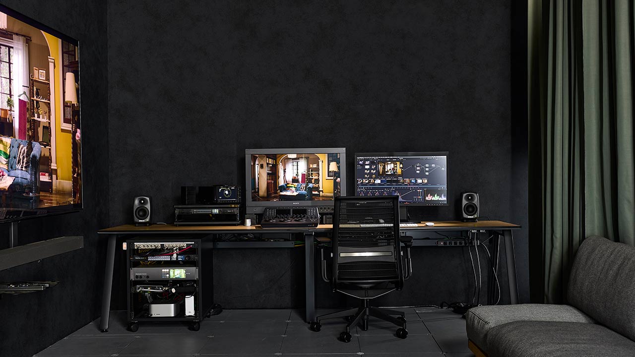 デスクの中央にはマスターモニター「BVM-HX3110」が鎮座し、DaVinci Resolveなどの定番ソフトに加え、クリエイターが持ち込むアプリケーションにも対応する最高スペックの環境が整う。撮影データを即座にグレーディング環境へ転送し、LEDウォールやクライアントモニターで確認できる構成により、撮影と仕上げの往復検証が同一空間で完結する設計となっている。