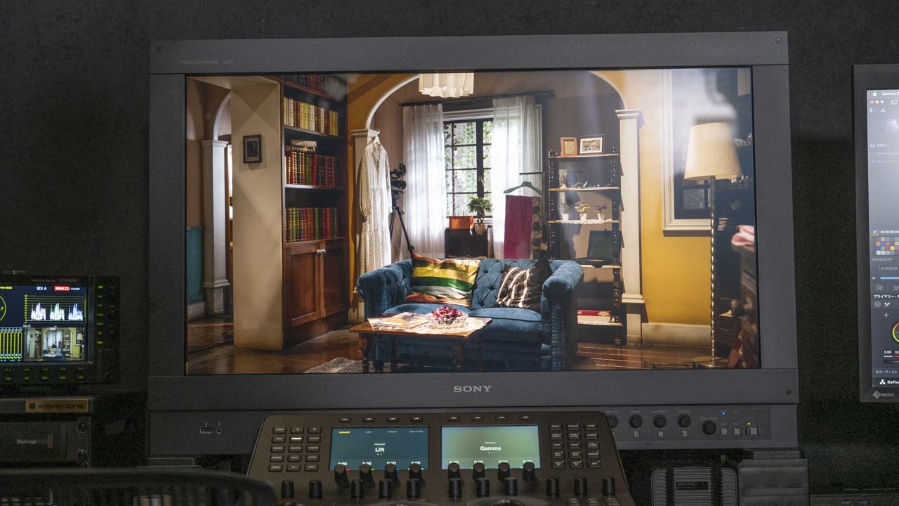 ゼロからスクラッチで組み上げられた美術セットは、ミッドセンチュリー調のポップな空間から、ライティングが重要な生活空間まで多岐にわたる。陶器と壁の白の差異、本職の美術監督による壁の「汚し」など、質感の再現性が緻密に計算されていた。ライティングパターンを即時に切り替えられる構成により、検証時間の短縮と反復作業の効率化が図られている。