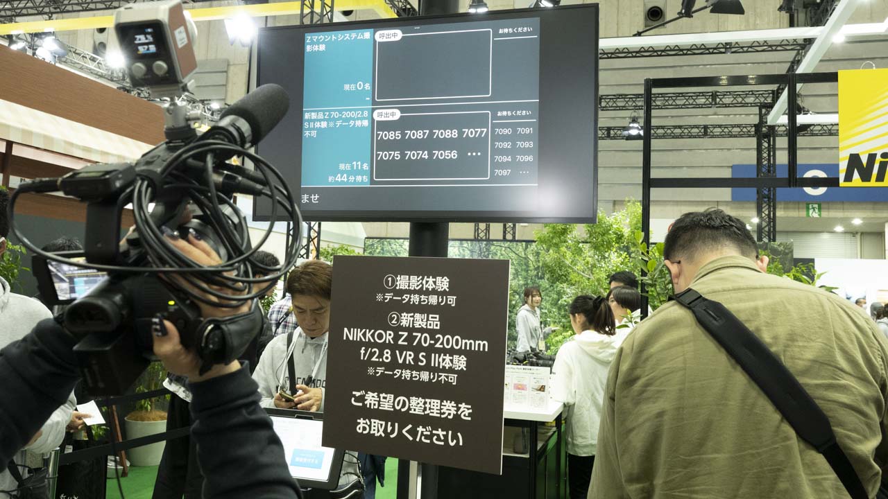 ニコンブースで最も熱を帯びているのが、先日発表された大口径望遠ズーム「NIKKOR Z 70-200mm f/2.8 VR S II」のタッチ&トライである。その注目度の高さは、体験までの待ち時間にも如実に表れていた。CP+初日の午前中には、待ち時間が最大で200分にまで達したほどだ。13時の時点で確認した際には、すでに新製品の整理券発行は一時中断されており、その過熱ぶりがうかがえる。まずは、この大きな期待を背負った新製品に触れた瞬間の、率直な印象から伝えていきたい。