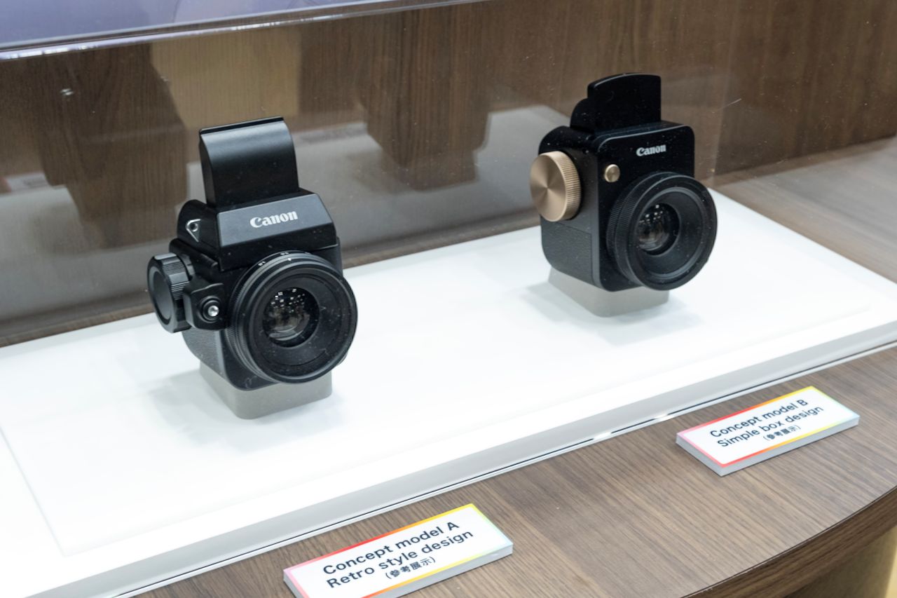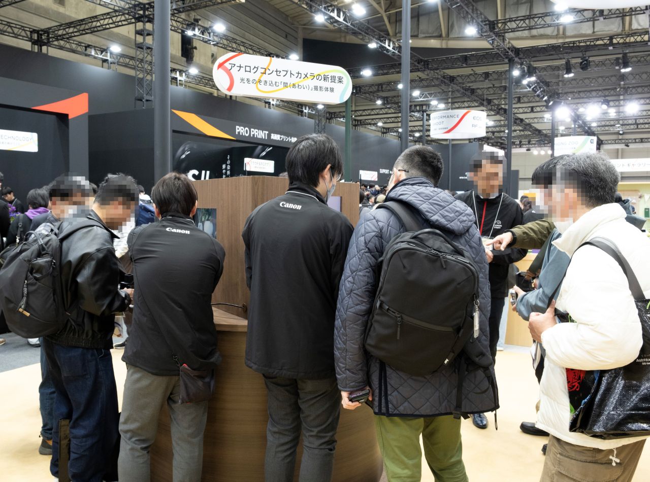 フィルムカメラのテイストを纏ったデジタルカメラを展示したのが、現在のカメラ業界の雄、キヤノン。ハッセルのような中判フィルムカメラのようなスタイルで、ファインダーを覗くと左右逆像。しかもマニュアルフォーカスでアナログライクな撮影体験が楽しめるものである。同社係員の話によると生成する画像は粒状感たっぷりで、フィルムで撮影したかのようなものになるという。参考展示ではあったものの、ハンズオンが可能で、めざとく見つけた来場者が順番待ちの列をつくっていた。