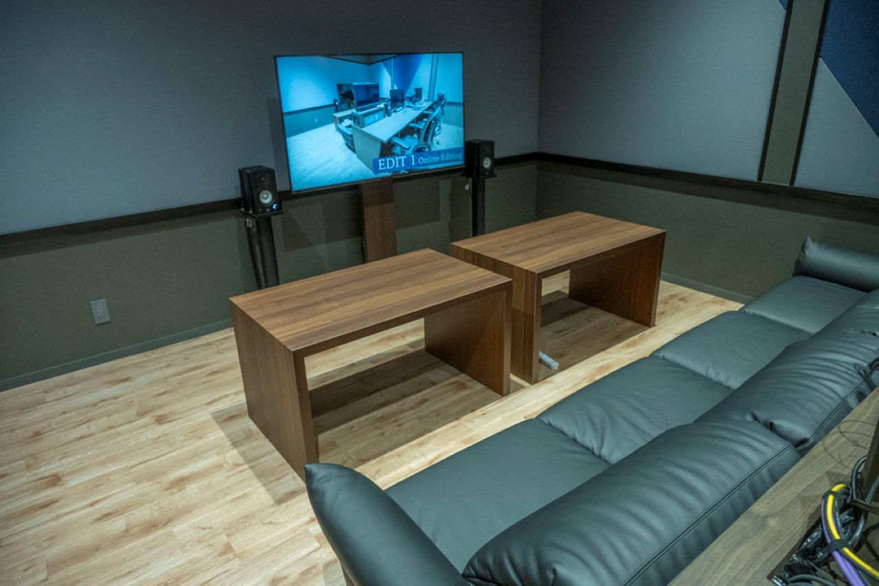 座席の配置も実務に即した工夫が施されている。エディターの周囲に監督や制作担当者が座り、双方向に意思疎通を図りやすいレイアウトを採用した。機材面においては、マスターモニターの型番こそ異なるが、操作用PCはオンライン編集室と同等のスペックを備えている。作業工程ごとの実用的な利便性を追求し、制作現場のワークフローに最適化した設計思想が反映されている。