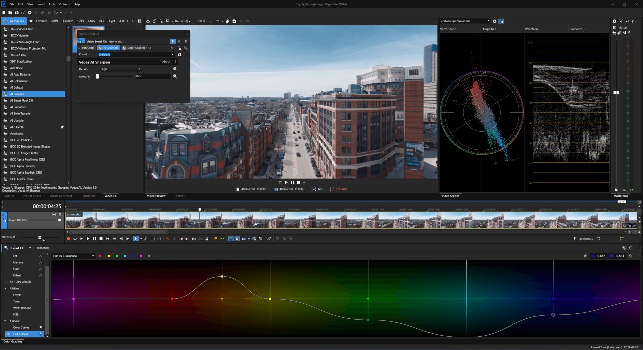 Vegas Pro UltimateにはVegas Pro Plusの機能がすべて含まれており、さらにその性能を新たな高みへと引き上げるという。受賞歴のある2つのVFXプラグインパッケージに加え、AIを活用したオーディオのノイズ除去やステム分離機能、さらには写真編集やデジタルアーティスト向けのツールも搭載されている。