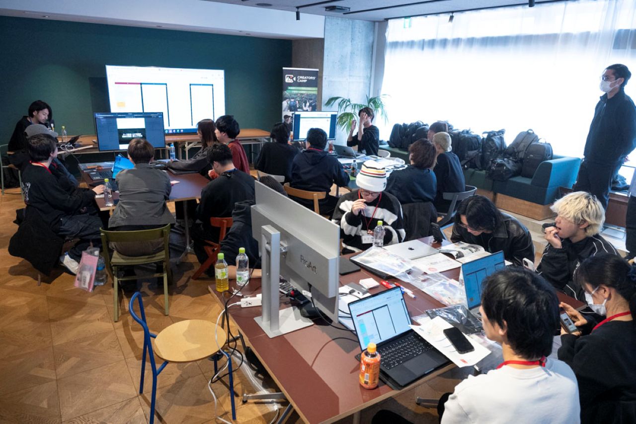 今回は参加者15名を4チームに分け、1チームあたり3〜4名で制作を進行する体制が組まれた。講師は第一線で活動するクリエイター8名で、各チームに2名ずつ配置される。異なるバックグラウンドを持つ講師が並走することで、企画面と技術面の両方から助言を受けられる点は大きい。さらにサポートスタッフも随所で支援に入り、参加者が制作に専念しやすい環境が整えられていた。