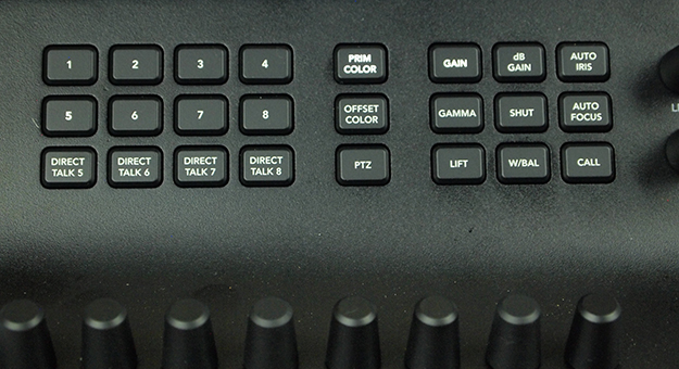 このトークバックとそして次に解説するカメラコントロールは、本機から送り返されるSDIリターン信号にコントロール信号がエンベッドされてコントロールが可能となっているため、対応型の同社製StudioカメラなどをSDI入出力2本を接続するだけで利用が可能となる。まず左端のトークバックコントロールでは、上記の相互通話が可能な外部カメラ4台との直接通話を可能とする、DIRECT TALKボタン5~8が設けられた。