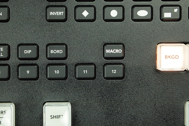 その上にある細かいスイッチは各キーヤーやDVEなどのソースやフィルをダイレクトに切り替えるボタンとなる。切り替えたい機能を選択し(赤く点灯する)ビデオソースならその下の1~8を押すとダイレクトに切り替わる。これを使うと、PnPのワイプ内のソースを一発で切り替えるなどの操作が可能だ。