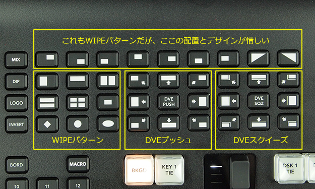 中段、中央部はトランジションの設定ボタンだ。MIX、DIPといった基本トランジションだけでなく、WIPEのパターン、DVEのパターン2種(プッシュとスクイーズ)の設定をパネル上に展開したものだ。この展開によってほぼすべてのトランジションが、ワンタッチで選択可能になったのは評価できる。