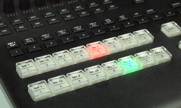 その右隣りは、1系統のアップストリームキーヤーと2つのダウンストリームキーヤーの操作ボタンだ。その間にはフェーダー式のトランジションスライダーが1本並ぶ。