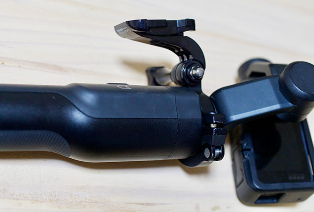 一番の特徴はGoPro本体との連携。装着時にはGoPro本体の電子接点と接続するために、電源のオン、オフは手元のボタンで操作できるのがありがたい。