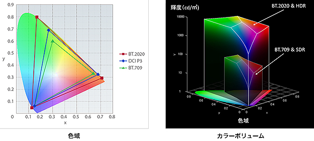 では進化した画質について紹介しよう。本機ではHDR記録が可能となったことが大きなトピックスである。このため対応したテレビでの評価視聴が必須と考えたことから、Sonyより4K HDRテレビもお借りして本機の評価を行うことにした。以下はSony BRAVIA KJ-65X9500Eに本機AX700を組み合わせた評価である。4KというとフルHDの4倍におよぶ高解像度やフレームレート、量子化ビット深度、色域の改善を主にアピールしてきたが、下記の図表をみてもらいたい。