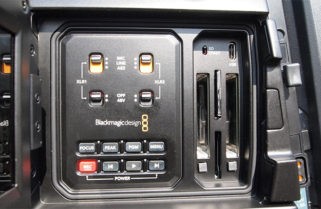 それらを収録するメディアは、CFast×2(UltraHD RAWまで対応)。SD UHS-IIカードスロットx2(UltraHD ProResおよびHD RAWまで推奨)と4スロットが用意されている。ちなみに収録可能時間は32GBのSD UHS-IIカードで、Ultra HD、Apple ProRes 422収録の場合約8分程度だった。