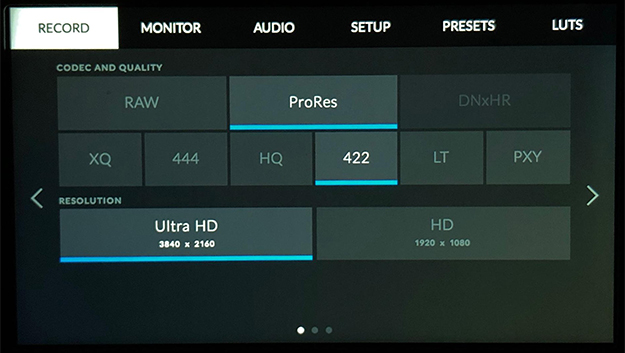撮影解像度はUHDの3840×2160とFHDの1920×1080の2種類で、SD解像度はサポートされない。フレームレートは23.98、24、25、29.97、30、50、59.94、60fpsのプログレッシブが基本だが、SDIでの出力では1080/59.94iなどのインターレース出力も可能だ。収録コーデックは、QuickTime ProRes mov収録が基本で、DNxHD、CinemaDNG RAWなどのコーデックも用意されている。