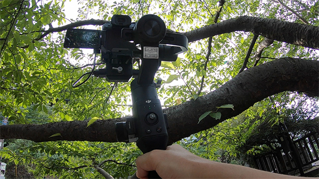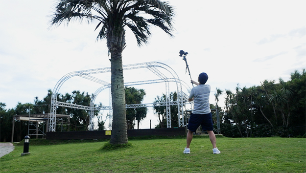 通常のスライダーを使用する場合は地面に置くか、三脚に固定して行う場合がほとんどかと思いますが、このようにちょっと高めのところを撮影しようと思うとかなり大がかりになってしまいますが、Ronin-Sであればこのように簡易に撮影も出来るので効率面でも非常に楽です。