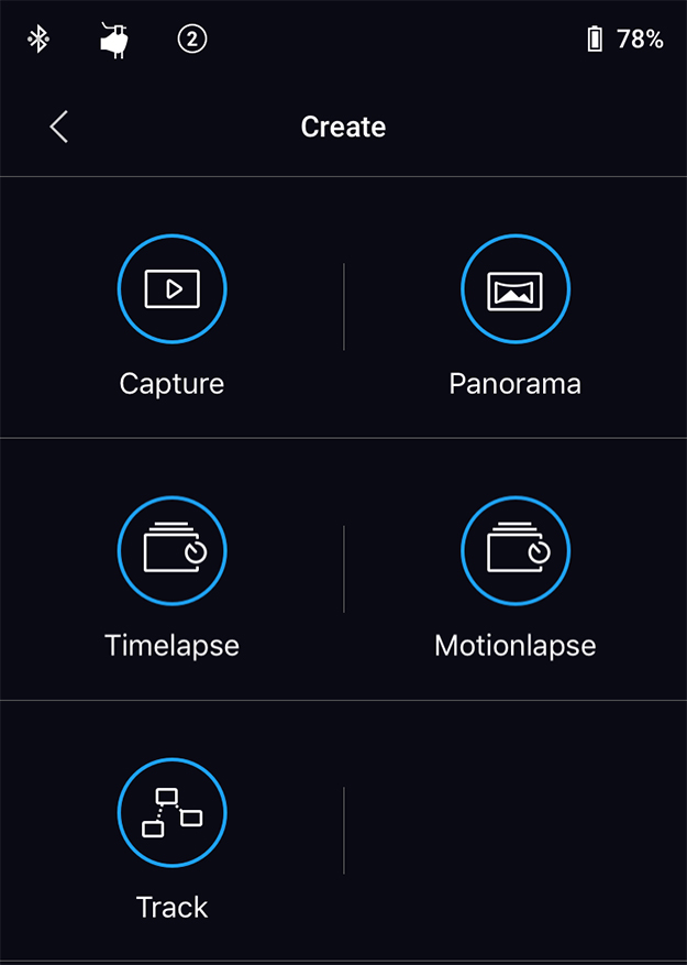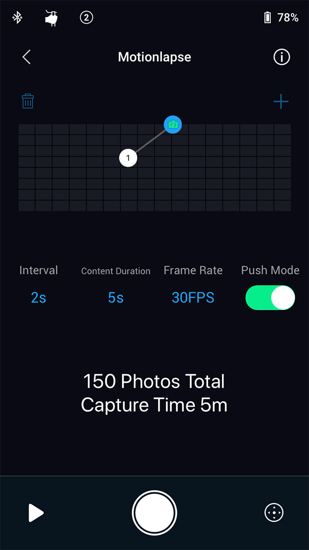 このように5種類の撮影方法があって、今回は「Motionlapse」を試してみました。タイムラプス撮影に動きを加える撮影方法になります。