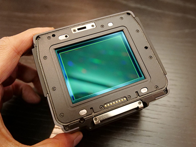 一体型デジタルカメラだが、デジタルカメラバックのブロックを外すことは可能。手元で53.4×40.0mmのCMOSイメージセンサーを見ることができる