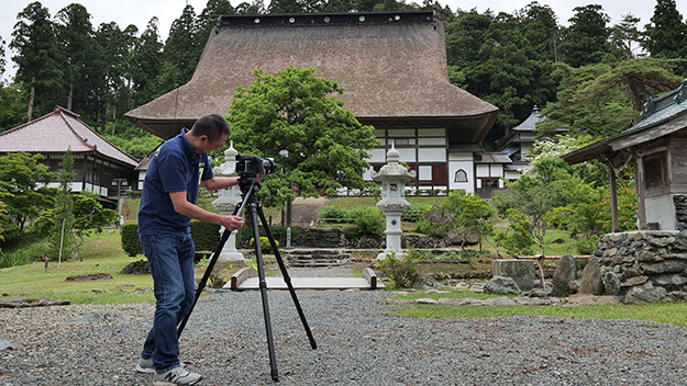まずは、岩手県にある重要文化財に指定されている正法寺へ宮大工の棟梁を訪ねて撮影に向かった。シンプルな装備で、本体にズームレンズを装着。三脚に取り付けて、案内をしてくれる棟梁を追いかけた。