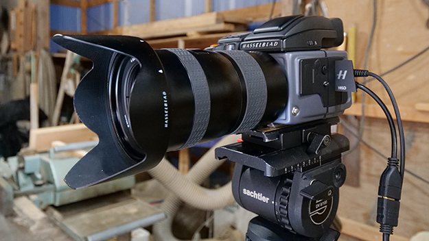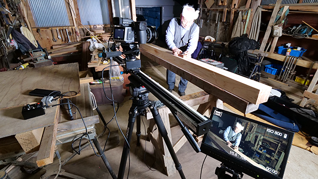 ビッグセンサーを搭載したH6D-100cであるが、小型軽量なのを特徴としている。そこで、棟梁の作業する動きを電動スライダーを用いて追従させて収録することもトライしてみた。