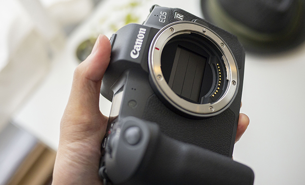 箱から取り出してまず思ったのは、小さく薄いということ。普段使っているGH5とボディを並べてみたが、大きさはほぼ互角でEOS Rのほうが若干薄く感じた。重さも体感的にGH5と変わらないか、それ以下だ。