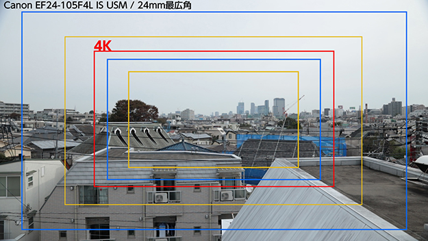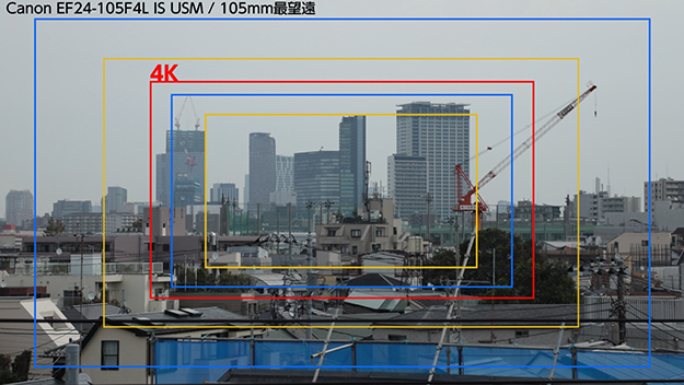 4Kに設定した時点でセンサークロップされ、35mm換算で約1.75倍の焦点距離になってしまう、というのは発表当時から残念なニュースであったが、実際に使ってみると逆にこれを利用する場面はあると思った。後述するが、所有していた24mm-105mm F4 EFを純正マウントアダプターを介して使った際、最望遠105mmからもう一歩寄りたい、という場面があり、逆にクロップは有効だった。30Pまでにはなってしまうが、4Kにすれば寄れる。つまりGH5で言うところのEXテレコン効果が得られる。