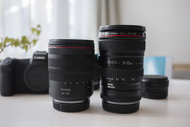 定番24-105新旧の比較画像。左は新製品のRF24-105mm F4 L IS USM。右はこれまでのEF24-105mm F4L IS USM。レンズマウント分伸びている感じになる