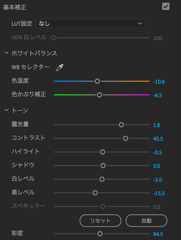 次に、ウィンドウレイアウトを「カラー」に変更してLumetriカラーエフェクトでの作業を行う際は、基本補正のパネルがLightroomとほぼ同じパラメータなので、対応するつまみがそのまま使用できてLightroomとほぼ同様の操作感となる。