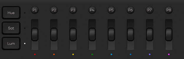 HLSについては、色相、彩度、輝度それぞれ用のボタンがあり、選択後に各色毎のダイアルで調整をする。