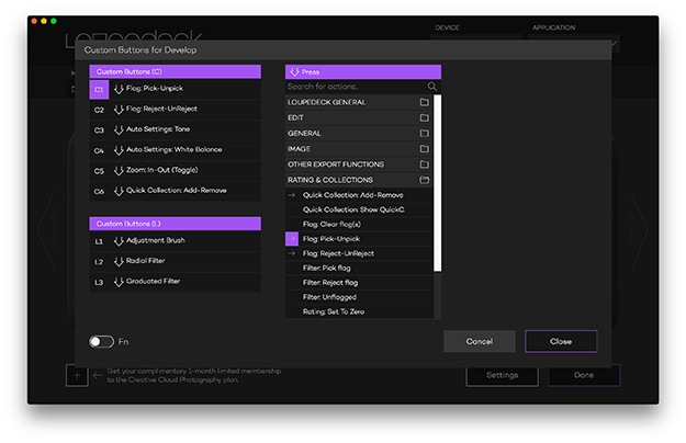 Premiere Pro用のユーザーガイドPDFには、通常のモード、「Fn」ボタンを押した状態、「Custom Mode」を有効にした状態、「Custom Mode」で「Fn」ボタンを押した状態それぞれでデフォルトでの割り当てがLoupedeck+本体図と共にわかりやすく表記されている。これはLightroomのユーザーガイドにもぜひ記載して欲しい。