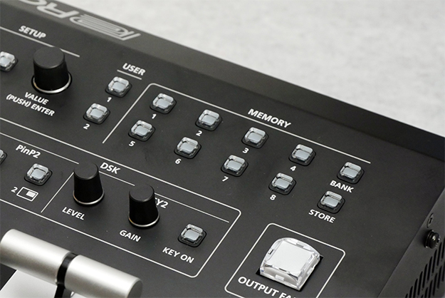 入力は6だがクロスポイントは8で、残り2つはフレームメモリーやバックカラーにアサインできる。キーセレクトは、V-60HDでは小さいプチプチボタンだったが、今回は小型ながらもクロスポイント用スイッチを採用しており、視認性が高まっている。