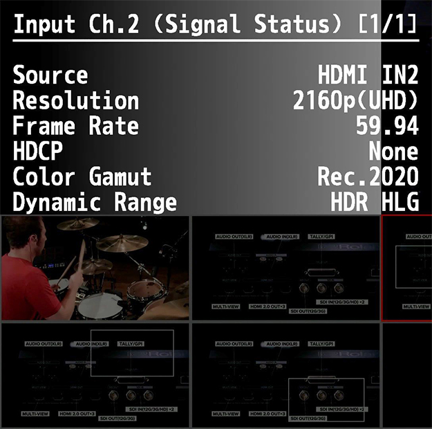 V-600UHDは、4K対応だけでなく、HDRおよびRec.2020にも対応している。しかもそこからSDR/Rec.2020にも変換できる。変換できるからなんだよ、とおっしゃるかもしれないが、イベントの現場では、HDRじゃないとうまく撮影できない事例も出てきている。例えば高輝度のLEDディスプレイを背景にしたステージ中継などだ。