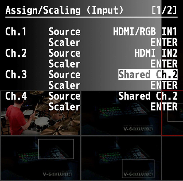 Input設定の一番上にある、Assign/Scalingにこの設定が集まっている。各チャンネルのSourceで、シェア元のチャンネルを選ぶことで、映像が分配されてくる。分配してスケーラーを通すことでディレイが気になるところだが、見た限りでは元ソースと分配先でのディレイはないようだ。そのあたりは1フレーム内で全部吸収しているという事だろう。