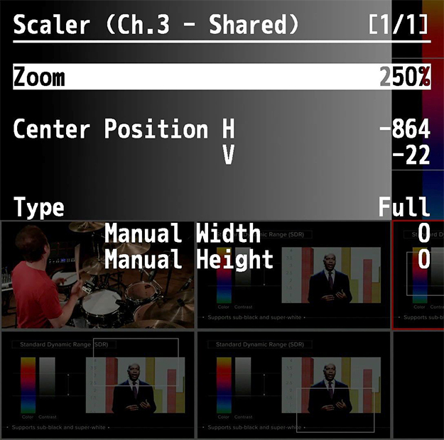 これは、次に来るであろう映像のポジションをあらかじめ「盗む」というオペレーションを想定しての事だろう。それはわかる。だがベテランのオペレーターは、「次」を仕込むのではなく、「次の次」を仕込むものなので、むしろメニューでスケーラーをいじり始めたら、ジョイスティックは自動的にそのチャンネルの操作に切り替わってくれた方がうれしい。メニューを出してなければPST列、メニューでいじっているときは該当チャンネル、というアクションで問題ないように思う。