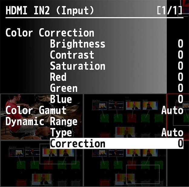 Correctionというのがそれだ。このパラメータの内部は複数の変換カーブからできており、それを+64から-64までの間で繋いでいく、という仕組みになっている。明るいところから暗いところまでのうち、そのシーンではどの部分を注視すべきかで感覚的に決められる。ビデオエンジニアならば、別途波形モニターを用意して波形の動きを観察すれば、このパラメータが何をやっているのか掴めるはずだ。本番投入する前に、一度実験して感覚的に掴んでおくといいだろう。