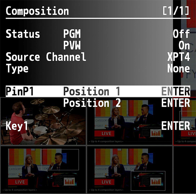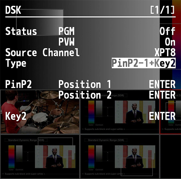 その代わり、PinPの機能が非常に充実している。PinPは1と2でそれぞれ別のポジション・サイズ、ボーダーが記憶できる。DSKにもPinPの1と2があり、同様に別々のポジション・サイズ、ボーダーが記憶できる。すなわち、同時に使えるPinPは2つだが、4種類のPinPがプリセットできるという事になる。
