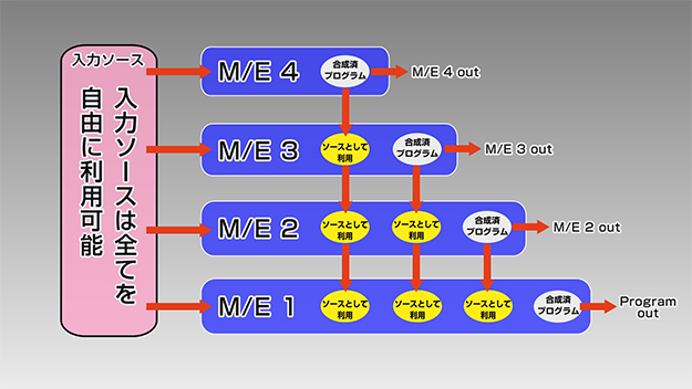 - 4段のM/E列、16段ものアップストリームキーヤー、4段のダウンストリームキーヤー